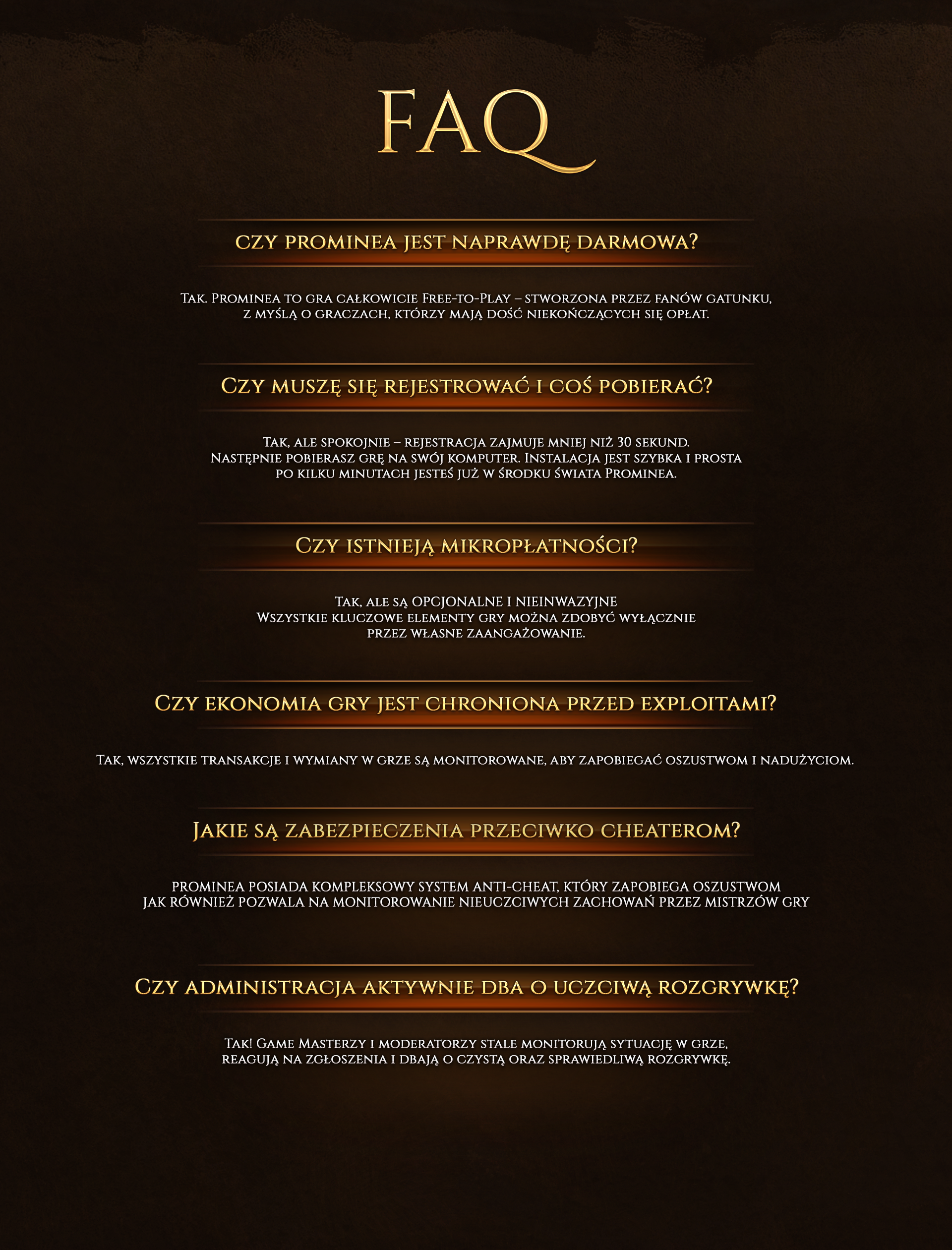 Darmowy Gameplay. Bez haczyków, bez ograniczeń. Prominea to czysta esencja gry. Free-to-Play, tu liczy się Twoja aktywność, nie grubość potrfela.Płynna Rozgrywka. Grasz kiedy chcesz i ile chcesz. Zero cooldownów, zero energii do odnowienia. Każda minuta daje Ci progress, nie frustrację.Gra dla weteranów. Nie tłumaczymy Ci MMO od zera. Jesteś tu bo wiesz czego chcesz. Dajemy Ci świat w którym od razu czujesz się jak u siebie.